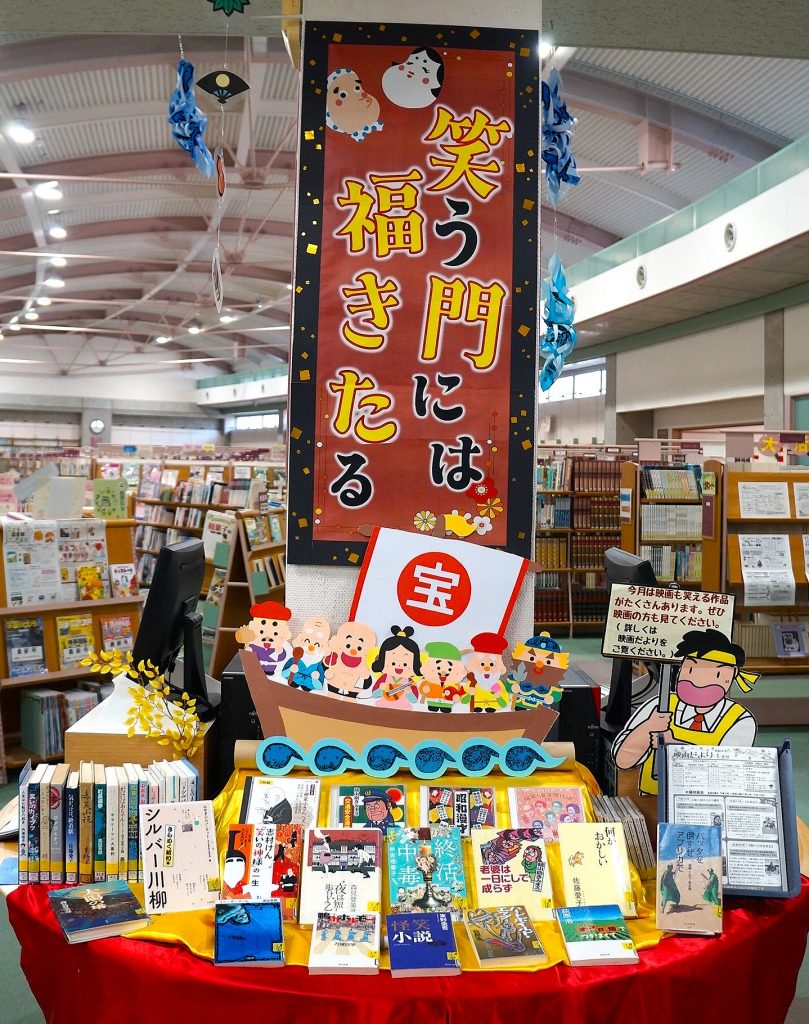 中央図書館では、皆さまの一年が楽しい年になることを願って、「笑う門には福きたる」、くすっと笑える、楽しい気持ちになれる本を展示しています。1月の水曜映画会も笑えるタイトルを集めていますので、ぜひ見に来てください。観覧は無料です。
