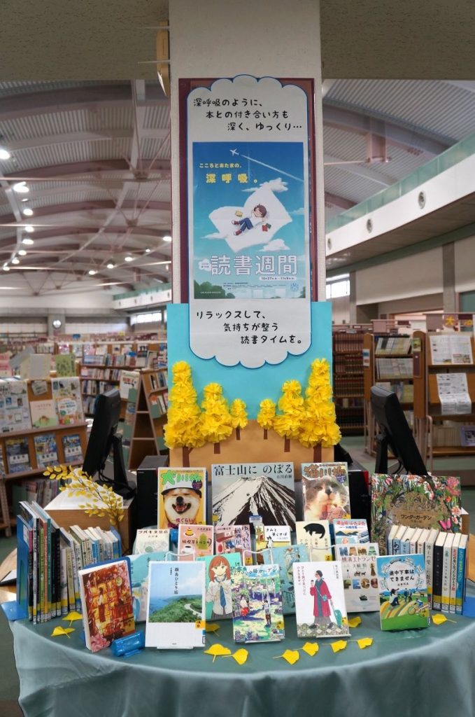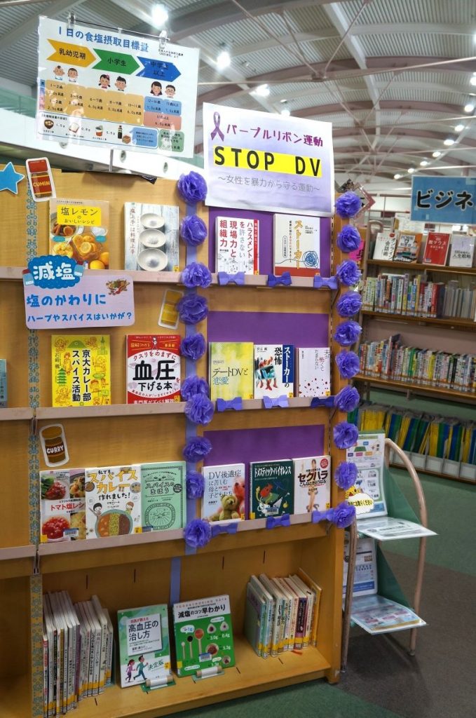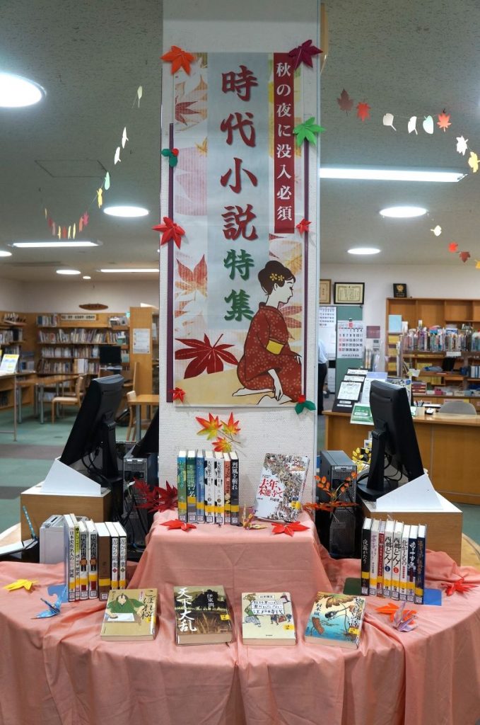 木々の葉の色が変わり始め、秋の訪れも目に見えてわかるようになってきました。今月の展示は、「こころとあたまの深呼吸」。この言葉は10/27~11/9の読書週間の標語にもなっています。リラックスして気持ちが整う読書タイムが過ごせたらいいなとの思いからそんなホッとする本を集めています。次に「時代小説特集」秋の読書シーズンに熱中できる時代小説を読んでみませんか?また、11月は「よか適塩でよか暮らし」「ストップDVパープルリボン」の運動月間にもなっていますので、関連の本を置いています。子どもの本のコーナーでは先月に引き続き「ものがたりレシピをいただきます」の本を展示しています。ものレピクエストもまだ開催中なので、リーフレットを持ってぜひ遊びに来てくださいね。